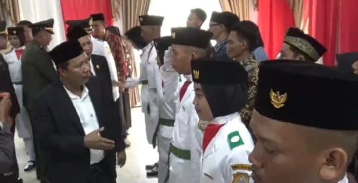 MUARASABAK – Bupati Tanjab Timur Romi Hariyanto, mengukuhkan 30 anggota Pasukan Pengibar Bendera Pusaka (Paskibraka) yang terdiri dari 15 putra dan 15 putri di Pendopo Rumah Dinas Bupati pada Jumat (16/08).