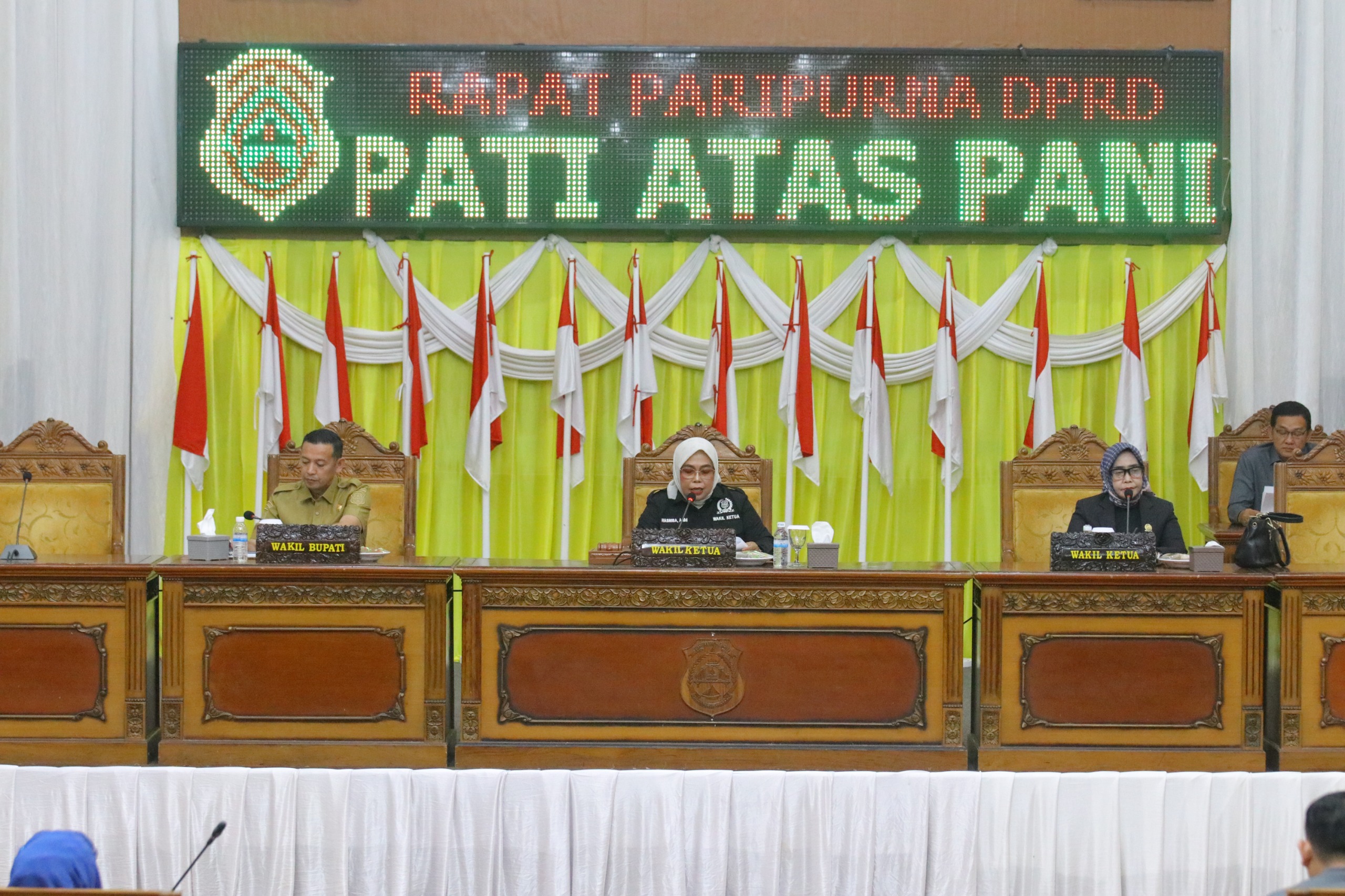 Rapat dipimpin oleh Wakil Ketua I DPRD Tanjabtim, Hasnibah, A.Md, didampingi Wakil Ketua II, Hj. Siti Aminah, SE, serta dihadiri anggota DPRD, Forkopimda, kepala OPD, dan tamu undangan.